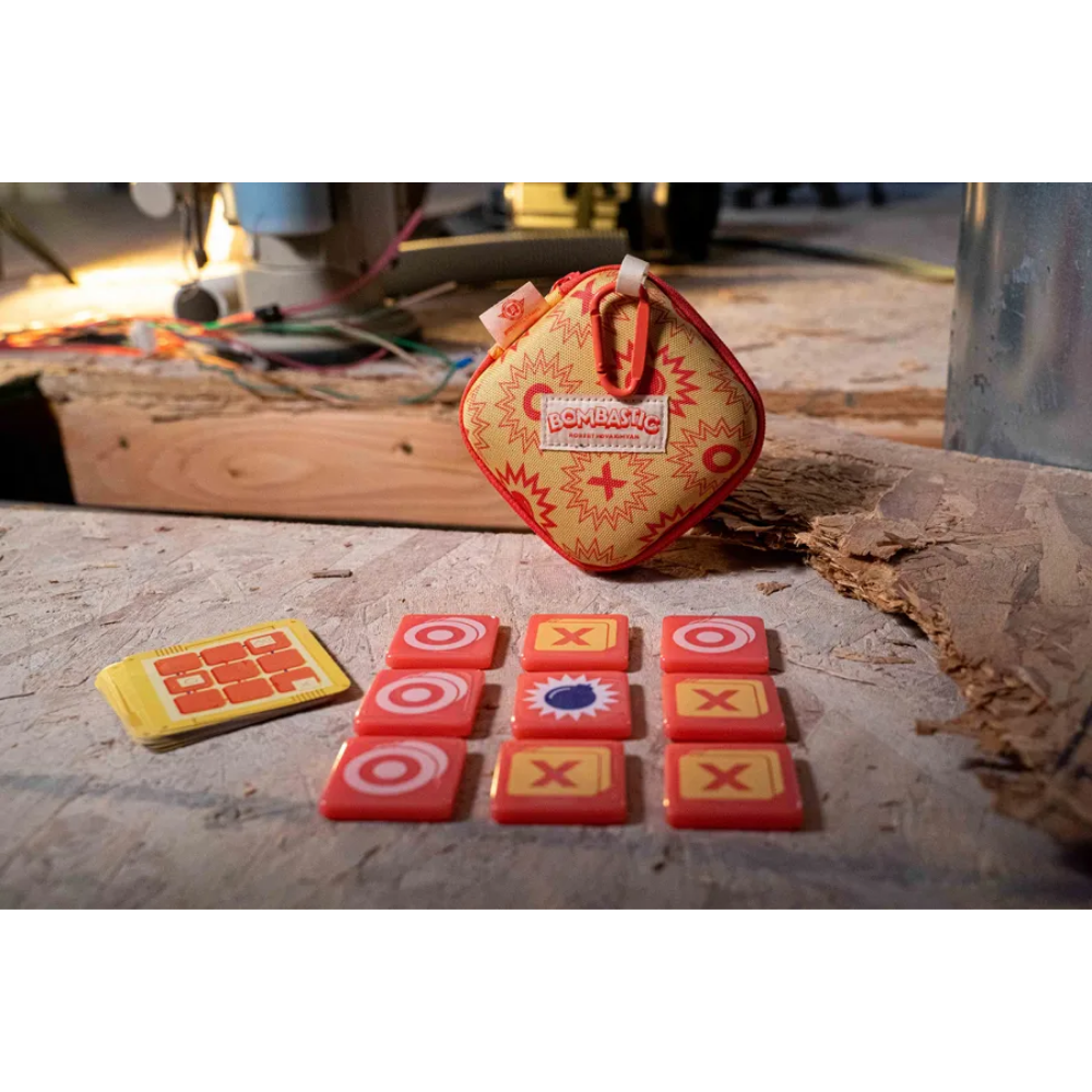 Bombastic is a spicy, five-minute, travel-friendly game for two players. One player is Xs, and the other is Os — pretty standard so far. But what you don't know can hurt you. Nine chunky tiles are shuffled face down into a 3×3 grid — 4 of them Xs, 4 of them Os, and the last? A ticking, delicate bomb. Can you find your tiles without blowing up?