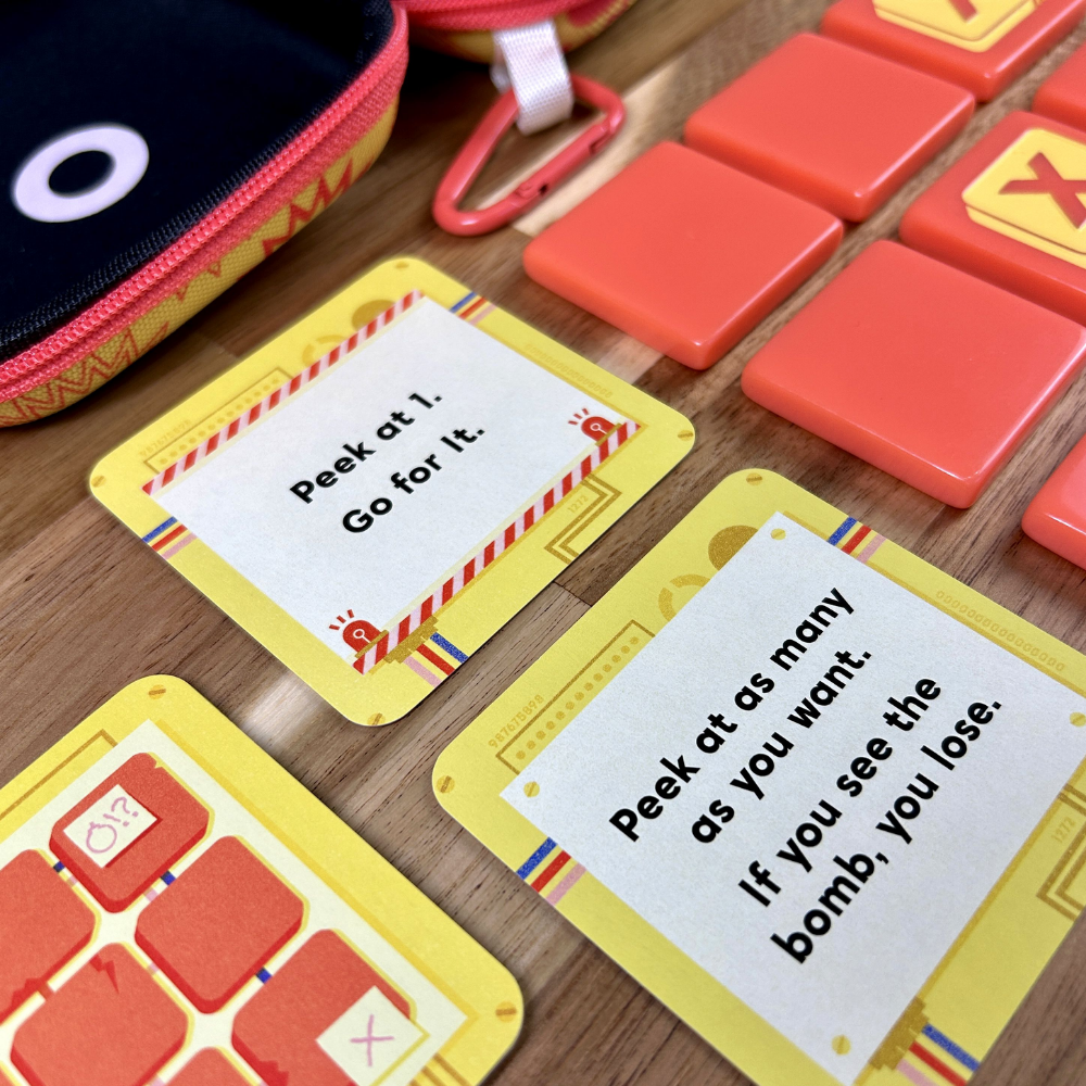 - Go for It — Show three tiles in a row. If they are yours, you win! If you show the bomb — BOOM! You lose! If you show any of your opponent's tiles, then you give them helpful information (whoops), but the tiles are placed back face down, and the game keeps going.