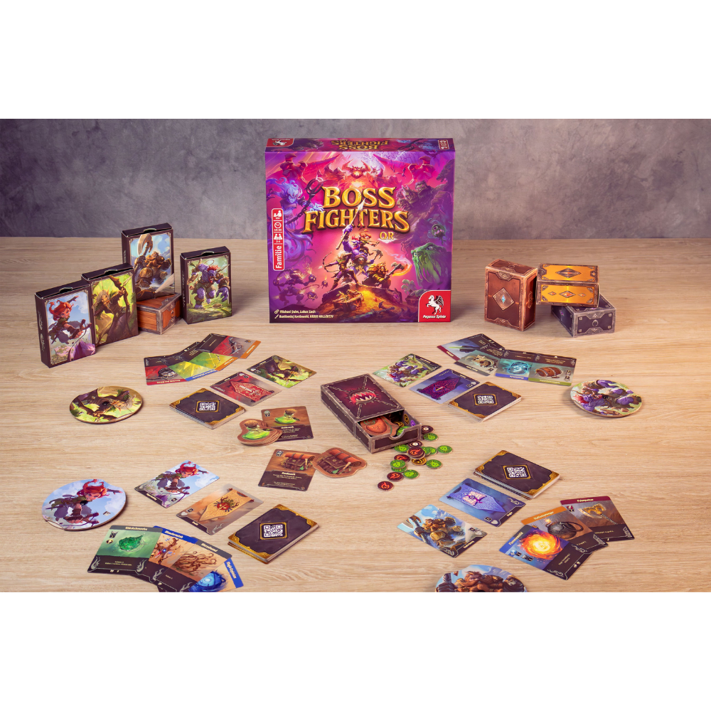 Boss Fighters QR is a cooperative fantasy campaign game where players battle against ten unique boss monsters that react tactically to their actions. This hybrid game combines elements of a classic card game with a digital app to create an interplay of strategic deck building and dynamic boss battles. The Scan&Play mechanic of Boss Fighters QR allows the game to instantly recognize player cards as they are scanned, which then triggers challenging responses – to the players’ choices, in real time.