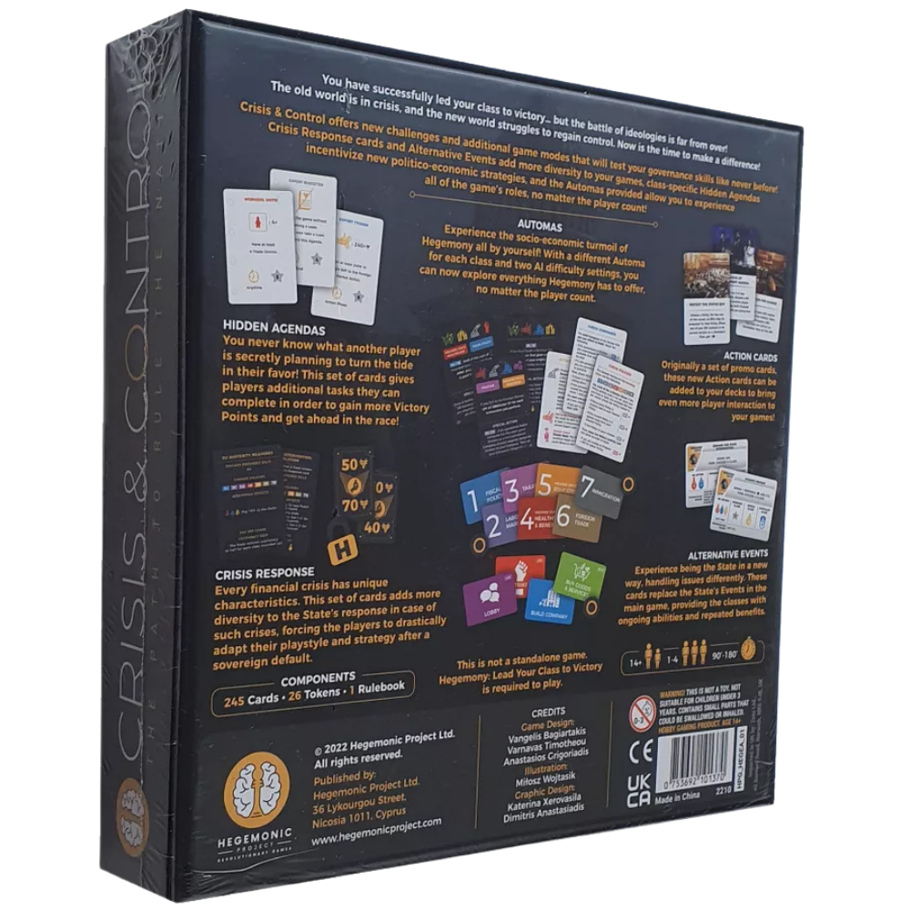 Crisis & Control offers new challenges and additional game modes that will test your governance skills like never before! Crisis Response cards and Alternative Events add more diversity to your games, class-specific Hidden Agendas incentivize new politico-economic strategies, and the Automas provided allow you to experience all of the game’s roles, no matter the player count!