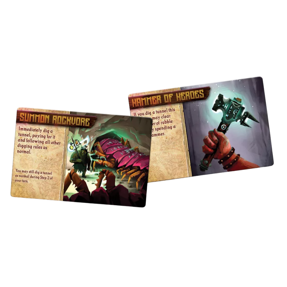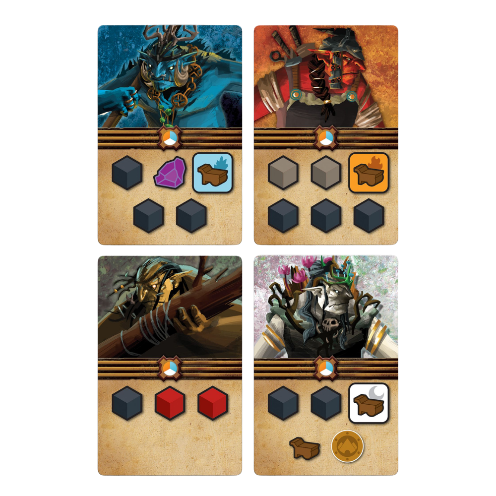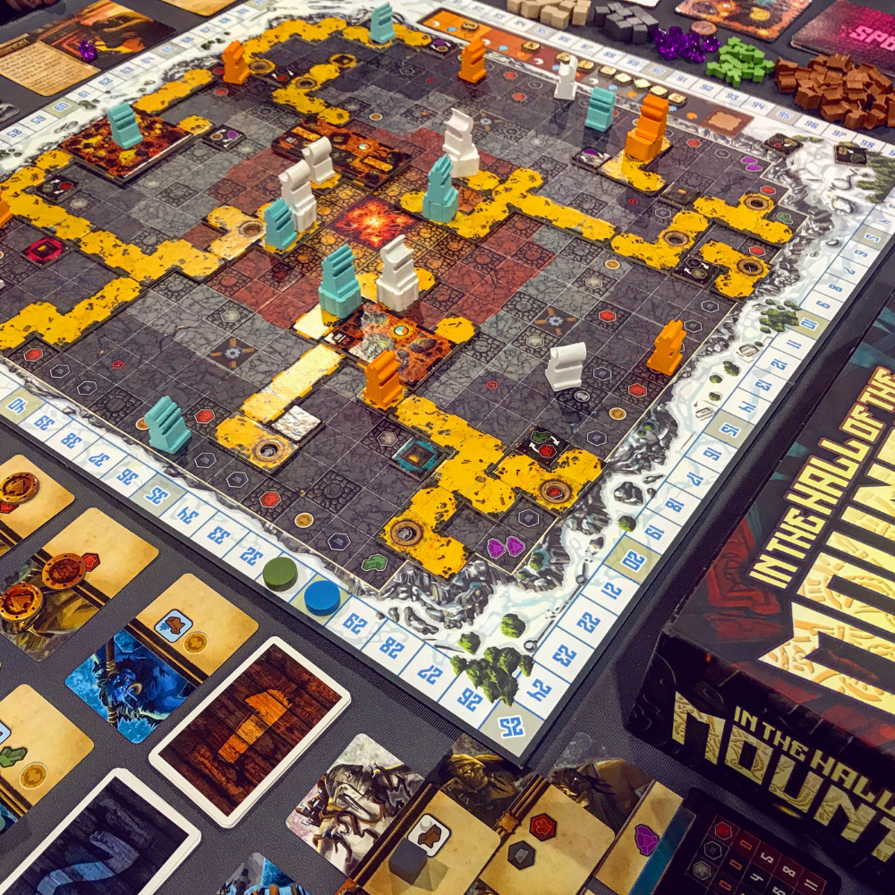 Working on the same game board with the other players (but beginning at your own entrance), you'll dig a competing network of tunnels by spending increasingly valuable materials to lay polyomino tiles onto the map. You want to extend your tunnels to connect with buried gold and materials, with workshop locations that can transform resources, and especially with toppled statues. Statues are key to scoring, and you'll spend carts to move them through the tunnels to prime scoring locations near the heart of the mountain.