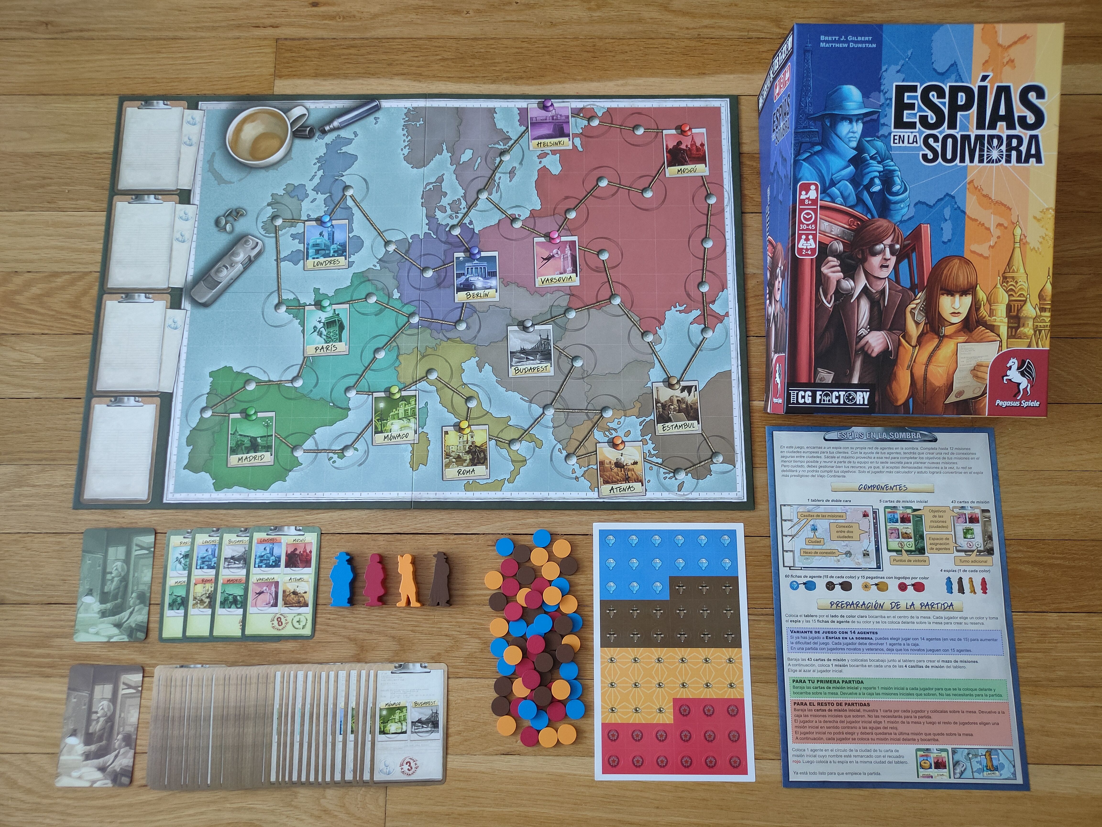 In Spy Connection, which was originally announced as Web of Spies, players travel Europe to fulfil their missions as quickly as possible. To fulfil mission cards, players have to build a route between all shown locations. While they are allowed to use their established network to fulfil future missions, their network is of limited size: eventually, to expand in one direction they will have to remove markers elsewhere, thus changing their network throughout the game to meet the current requirements. Whoever manages to fulfil seven missions first wins.