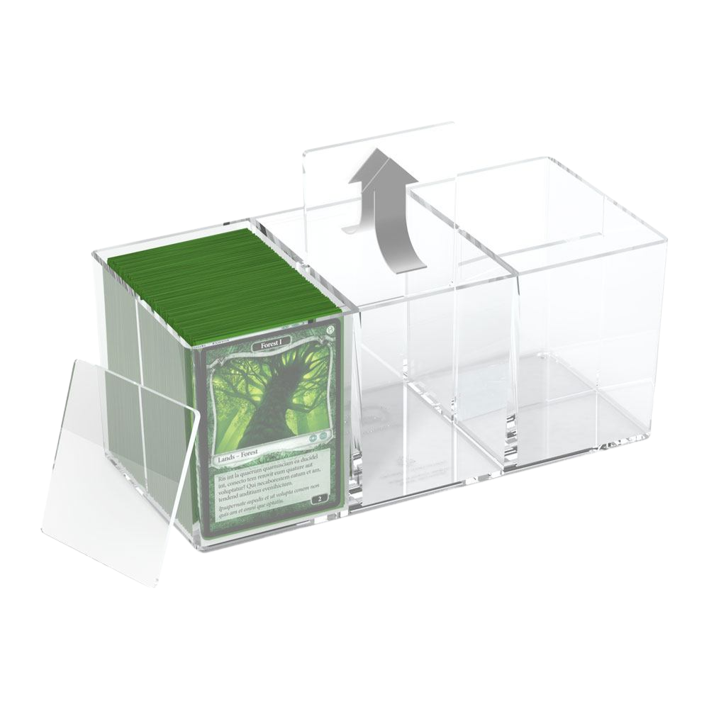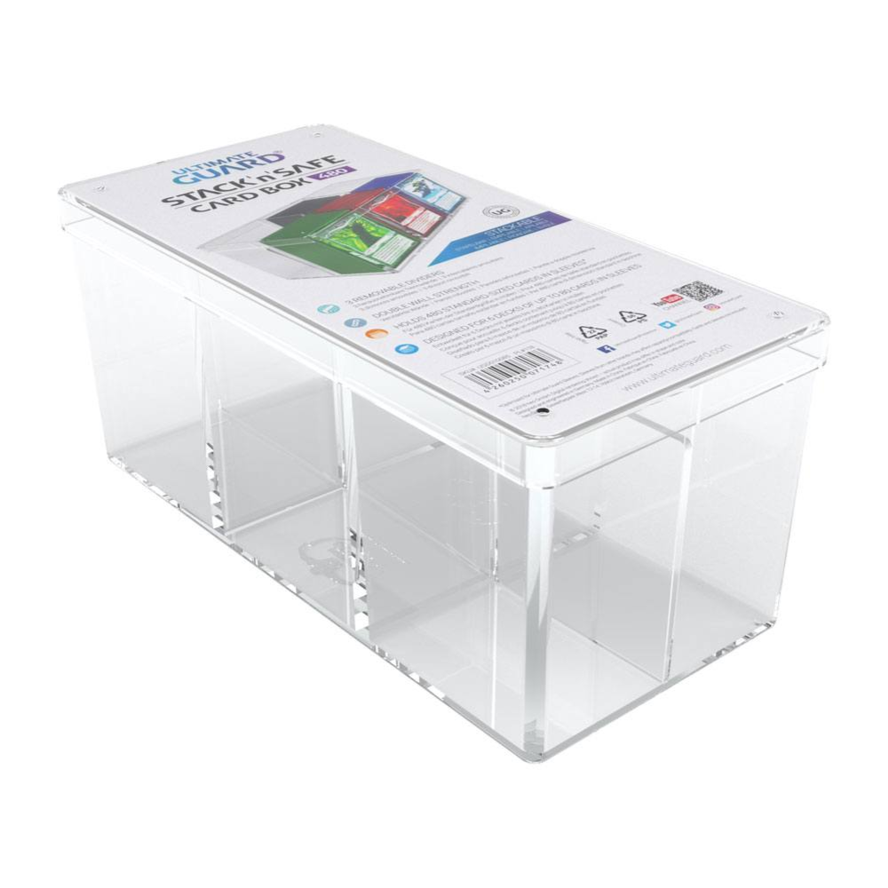 The Stack´n´Safe Box 480 from UG´s line of high quality card boxes is made of clear polystyrene and can hold up to 480 (6 x 80) cards in sleeves (e.g. ULTIMATE GUARD Supreme Sleeves). The sturdy box has 6 equally sized compartments and features three removable dividers. The easy to remove lid fits perfectly and keeps your cards safely in place.