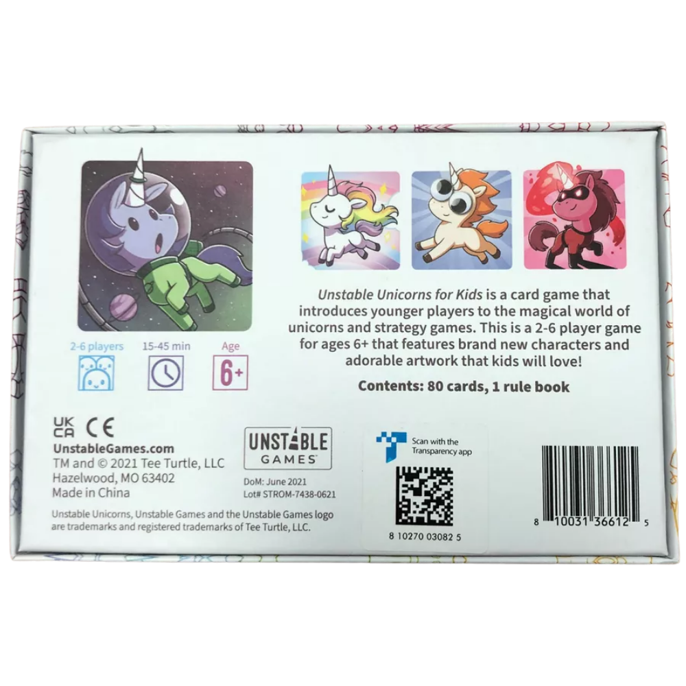 Unstable Unicorns for Kids features eight Colorful Unicorn card themes, including Hero, Animal, Princess, Space, Sports, Goofy, Rainbow, and Fantasy. With cards like Sock Puppet Unicorn, Astronaut Unicorn, and Mermaid Princess Unicorn, the game has a unique unicorn (a uniquecorn, if you will) for everyone!
